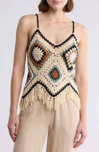 Patterned crochet knitting enhances the homemade look and feel of this beach-to-cocktails cover-up tank.