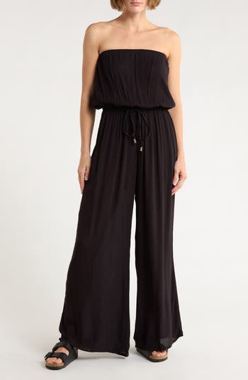 Elevate your beach look in this stunning strapless jumpsuit made from lightweight gauzy fabric and cinched at the waist by a tonal drawstring.