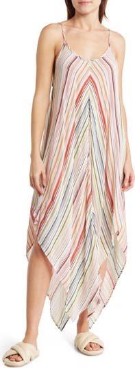 Colorful stripes add sunshine-ready style to this charming sundress featuring an asymmetric hem that flutters with every step you take.