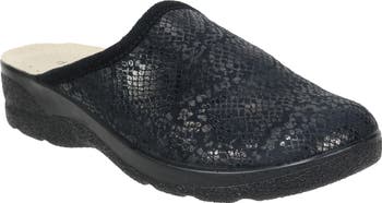 Snake print adds a sophisticated finishing touch to a classic clog set on a comfort-cushioned insole.