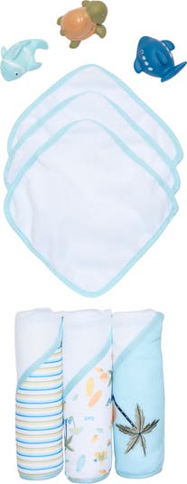 A set of bathtime essentials have you prepared to conquer your nightly routine with baby, featuring an assortment of tropical-themed towels and a trio of water-friendly toys.
