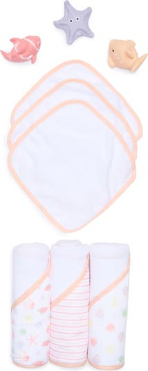 Perfect your baby's bath-time routine with this assorted set featuring a trio of tot-sized towels, washcloths and ocean-themed water toys they can swim and splash around with.