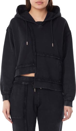An asymmetrical design gives an edgy look to this casual hoodie crafted from pure cotton.