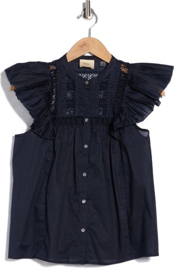 Inset lace trim and ruffled cap sleeves bring a romantic touch to this button-up top cut from lightweight cotton poplin.
