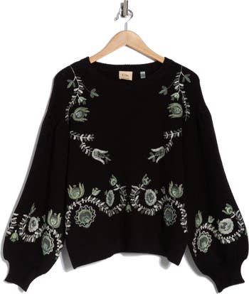 Boho-inspired floral embroidery charms this cozy crewneck sweater knit with billowy sleeves and ribbed trim.