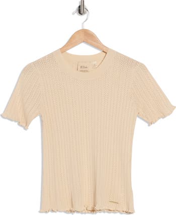 Pointelle stitches enhance the polished style of this short-sleeve sweater knit from soft, lightweight yarns in a fitted silhouette.