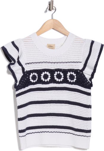 This cotton‑blend open‑knit sweater features a classic crewneck and ruffled cap sleeves, adding soft texture to any look.