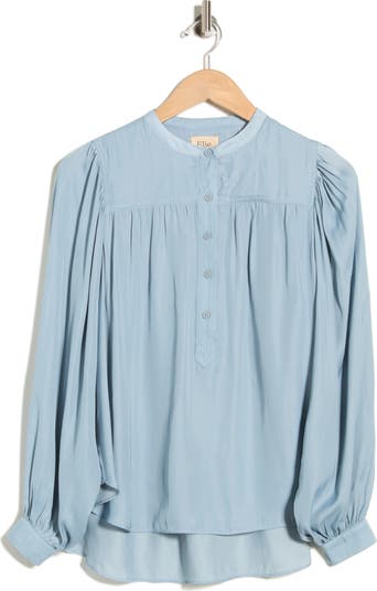 A buttoned placket allows you to customize your coverage in a satin top framed by blousy sleeves.
