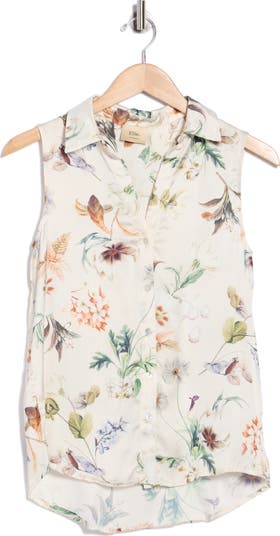 Brighten your day with this sleeveless button-up top fashioned with a high-low hem and a charming botanical print.