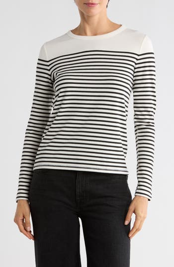 Classic stripes and a contrasting neckline accent give this long-sleeve knit top effortless charm.