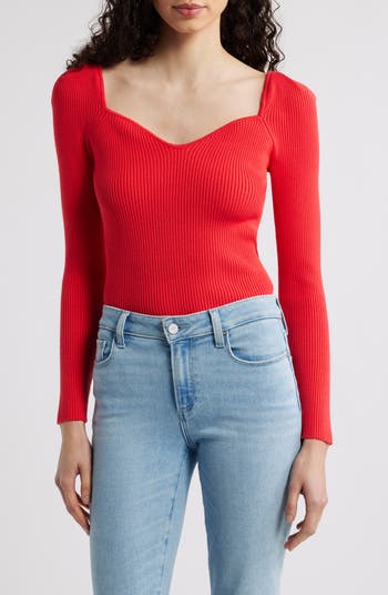 A unique sweetheart neck refreshes a soft and comfortable sweater covered in ribbing for a close fit.