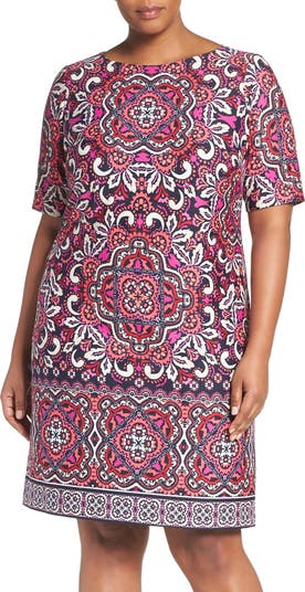 Exotic patterning in a pretty palette of pink and coral tones brings global chic to a supple ponte-knit shift cut with elbow-length sleeves.