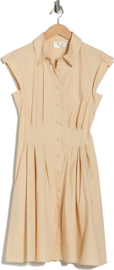 Show off charming style in this crisp cotton-poplin shirtdress fashioned with cuffed cap sleeves and an elegantly darted waist.