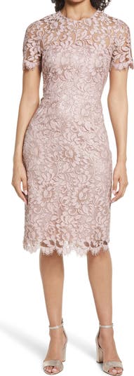Bring the metaphorical rosé to your next soirée wearing this blush-hued sheath overlaid with floral embroidered lace and edged in wispy eyelash trim.
