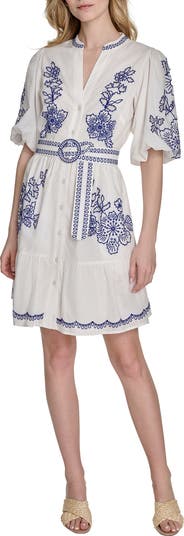 Bold embroidery pops on the crisp cotton of this belted shirtdress framed by voluminous puff sleeves.