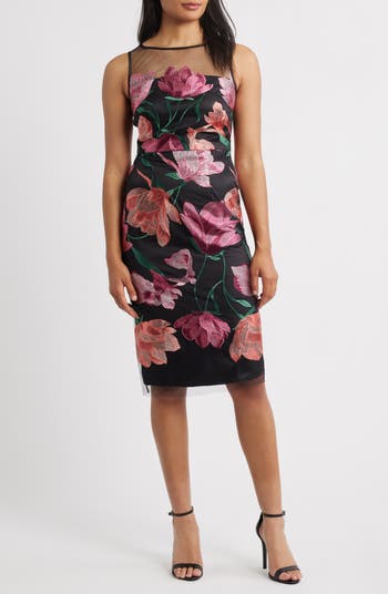 Beautifully embroidered flowers add whimsical elegance to the mesh overlay of this stunning sheath perfect for your next formal event.