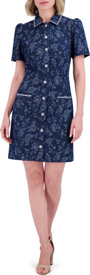 A denim dress is elegantly elevated with puff sleeves, pretty blooms and sparkling beadwork tracing the collar and pockets.