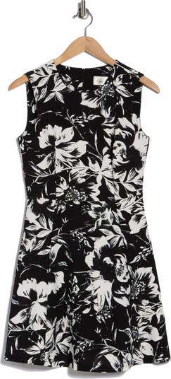 Moody blooms make a splash on this black-and-white shift dress made of lightweight, stretchy fabric.