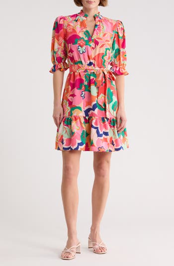 Vibrant flowers adorn this charming fit-and-flare dress fashioned with pretty puff sleeves and a fluttery flounced hem.