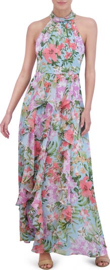 Bring the garden to the party in a flower-filled maxi dress that ties behind the neck and is gracefully cut to show off your shoulders.