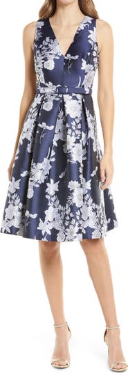 Delicate flowers adorn a stunning fit-and-flare silhouette featuring a belted waist to show off your curves in style for a classy desk-to-dinner staple.
