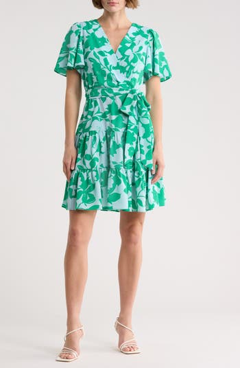 A vibrant floral print brings whimsical charm to this fit-and-flare dress framed by romantic flutter sleeves and a whimsically tiered skirt.
