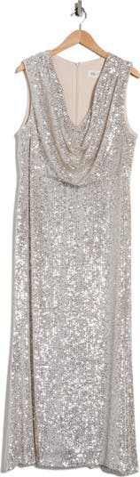 Glistening sequins enhance the glamorous allure of this sleeveless gown made with a draped neck.