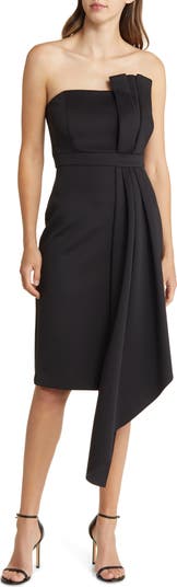 Make a bold statement before ever saying a word when you enter wearing this brilliantly colored strapless cocktail sheath with sculpted, asymmetrical detailing.