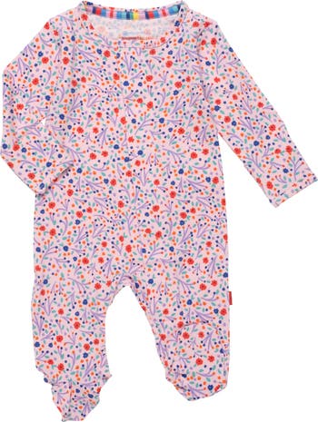Colorful wildflowers cover a supersoft jersey footie designed with magnets instead of snaps or zips for easy changing.