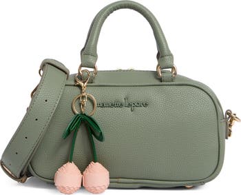 A cherry charm adds on-trend appeal to a structured satchel bag that can be carried by the top handles or crossbody strap for versatility.