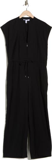 A drawstring waist and cap sleeves enhance the utilitarian aesthetic of a woven jumpsuit that flares out into full-length wide legs.