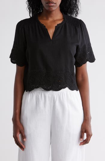 Scalloped trim and embroidered eyelets frame a short-sleeve popover shirt cut from lightweight linen-kissed fabric in a playfully cropped silhouette.