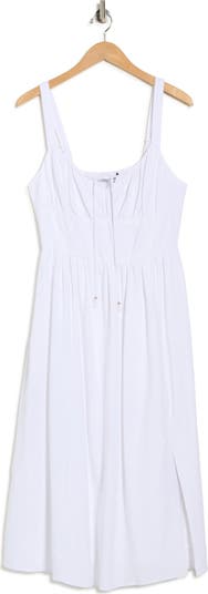 A front keyhole with adjustable ties allows you to customize your coverage in a charming midi dress cut with a touch of linen for an airy fit and feel.