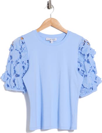 Perfect for warm-weather days, this stretch-cotton knit top is framed by romantic floral-lace sleeves.
