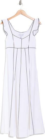 Piped trim neatly outlines a fit-and-flare midi dress framed by fluttery cap sleeves and cut with a kiss of linen for a breezy feel.