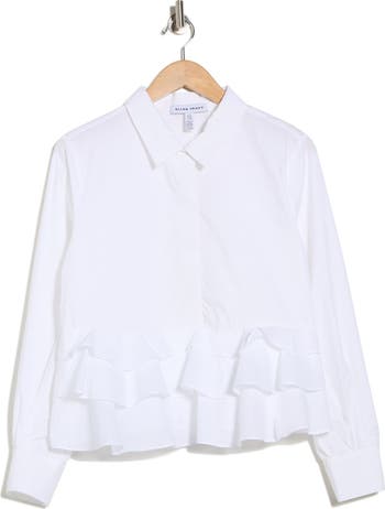 Evoke polished style in this crisp cotton-poplin shirt framed by a hidden-button placket and a whimsically ruffled peplum.