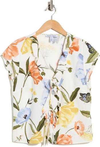 Frilly ruffled trim and dainty ties deliver romantic charm to a cap-sleeve top made with a touch of linen for a breezy fit and feel.