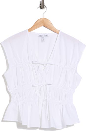 Elevate your warm-weather wardrobe with this sleeveless top finished with shirring, a peplum waist and front ties.