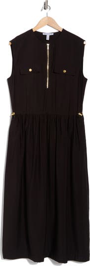 An adjustable drawcord waist and side pockets bring comfort and function to this sleeveless dress finished with polished hardware and a front zipper.