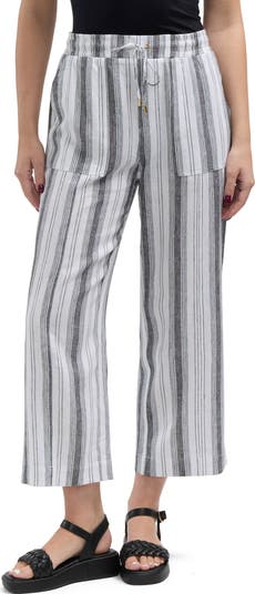 Patch pockets adds trendy utility style to these easy and breezy drawstring pants made from a lightweight linen blend.