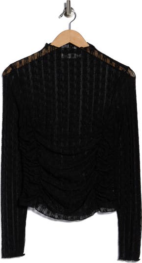 Love to layer with this romantic floral lace top fashioned in a fitted silhouette and accented by side ruching.