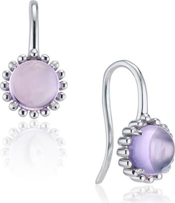 Floral drop earrings crafted from polished sterling silver showcase domed amethyst centers with dotted milgrain halos.