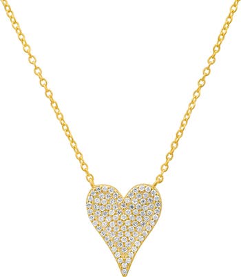 Twinkling cubic zirconia dusts this elongated heart pendant strung from a chain that shines in sterling silver or 14-karat-gold plated sterling silver.