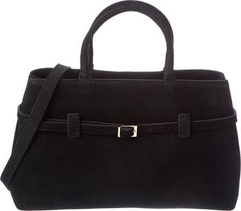 A polished buckle strap accents the center of this spacious satchel made from soft, buttery suede and outfitted with an optional strap for versatile carrying.