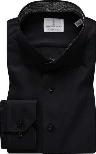 Crisp cotton twill cast in a deep, rich black makes a distinctive foundation of a dress shirt that's tailored with traditional detailing and styled to embolden any semiformal look.