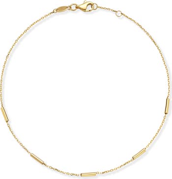 Bar stations enhance the gleam of this delicate chain anklet crafted from 14-karat gold.