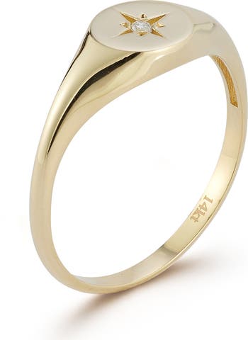 A single diamond bursts at the center of this signet ring cast in gleaming 14-karat gold.