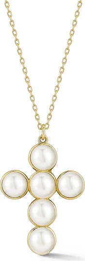 Lustrous freshwater pearls compose a dainty cross pendant strung on a 14-karat gold chain.