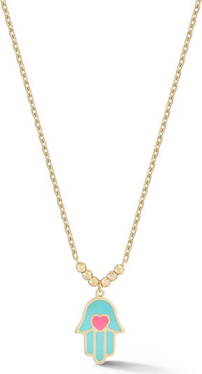Colorful enamel brings whimsical style to this hamsa pendant suspended from a fine 14‑karat gold chain.