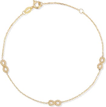 A trio of twisted infinity charms stations around this dainty chain bracelet crafted from warm 14-karat gold.